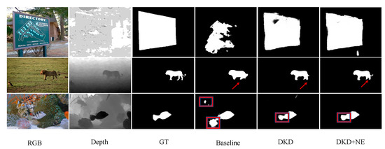 Noise Elimination with DKD. We investigate the low accuracy issue in teacher network by visualising extremely hard samples which has been shown in Figure 4. It is observed in Table 3 that with the help of noise elimination, all evaluation metrics over four testing datasets approach better results. Red arrows and rectangles in Figure 9 label the details which are refined by the proposed methods, especially on the part of object in the low contrast background, further illustrating that the proposed noise elimination effectively mitigate the noise during distillation and make the student model be able to learn more semantic details in the useful training data.