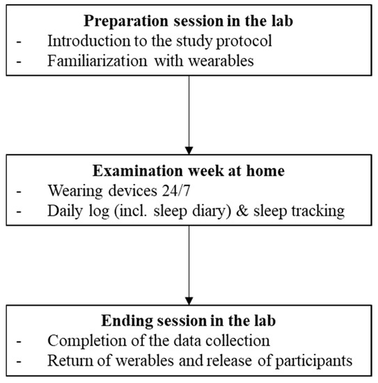 To compare the sleep measures from the sleep diary and three common consumer wearable devices, participants were asked to assess their sleep for four consecutive nights. The study was designed as a within-subject protocol and lasted ten weeks overall. Figure 1 illustrates the examined study protocol.
