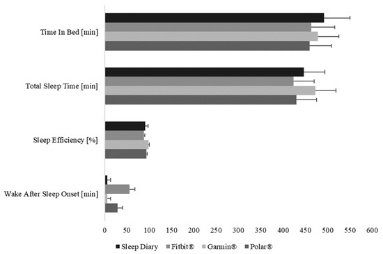 The important role of high sleep quality for well-being, health, and peak performance is well acknowledged [1,2,3]. In terms of health literacy, proactive and targeted dealing with own sleep patterns is also becoming increasingly relevant [4,5]. A popular trend in this context is self-tracking by using wearable consumer sleep technologies such as fitness trackers or smartwatches as easy to handle and time- and cost-efficient tools [6,7,8]. Wearables are portable sensors that track activity combined with the recording of physiological parameters such as heart rate or body temperature. Connected to a mobile application, this information is usually available to the consumer in graphic form on an ad hoc basis. However, the measurement accuracy of respective devices and the requirements for handling the collected data still need to be seen as critical [9,10,11,12]. Hence, there is a need for research investigating the measurement accuracy, especially of market-leading devices, in order to prove the validity and reliability of their outcomes [13]. As many people already use such wearables to track their everyday activities, the additional recording of sleep quality using the same system is cost-efficient and highly feasible [14,15]. It might be considered that wearables measure what they claim to measure, but at the same time, due to the technical development of the devices and the underlying algorithms, which are constantly adapted, it can be assumed that they generally do not come 100% close to the values of the gold standard or even do not assess all parameters measurable in polysomnography (PSG; [16,17,18,19,20,21]). It should be noted that lacking access to the raw data of wearables does not allow any quantification or overall associated statistical comparison of sleep stages. Researchers are currently approaching this problem by developing their own algorithms or programming neural networks to capture raw data [22,23,24,25]. This, in turn, reveals the need for research regarding the feasibility and practical implications for the devices’ usability [26,27,28]. Accordingly, as most of the sleep research has been conducted in the laboratory setting and little is known about the consumer wearable devices’ ability to measure sleep in free-living conditions, the aim of the present study was to assess the level of agreement of sleep measures between a standardized sleep diary, i.e., the gold standard in non-laboratory conditions, and three available consumer sleep technologies.