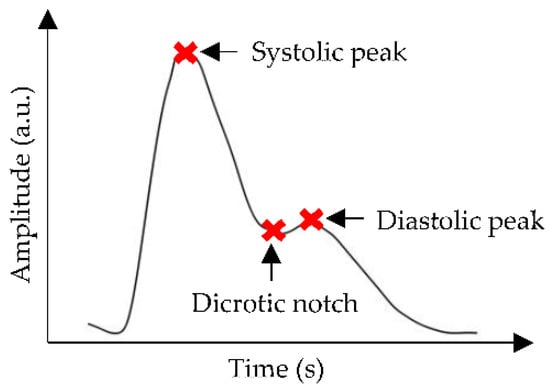 The generation of a PPG pulse is based on an optical principle that involves the interaction between a light-emitting diode (LED) and a photodetector (PD). LED emits light on peripheral tissues, and then the light is scattered to the extent where only a proportion of the light is absorbed by the tissues. PD measures differences in absorbed light as arterial blood volume changes during a cardiac cycle [33]. Typically, a PPG waveform consists of three significant points: systolic peak, dicrotic notch, and diastolic peak, as shown in Figure 2. These peaks define the highest and lowest BP values during one cycle of heart activity; meanwhile, the notch represents the backflow of blood into the heart, which causes the closure of the aortic valve [34].