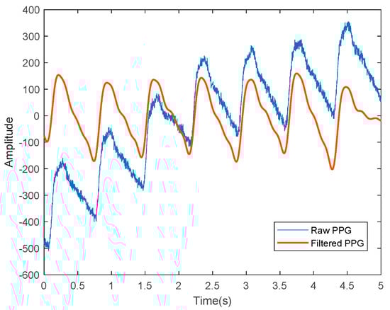 A representation of the PPG signals, where the blue line represents the raw PPG signal before denoising and the red line shows the filtered PPG signals that are ready for further analyses.