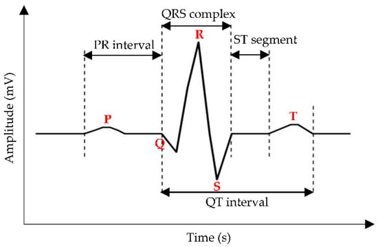 The ECG waveform consists of electrical cardiac depolarization and repolarization phase recordings measured in the time domain [43], and the sinusoidal pattern of PQRST complexes highly correlates with heartbeat rate [44]. Based on Figure 4, the P wave indicates atrial depolarization within 0.11 s and a maximum amplitude of 3 mm. The QRS complex denotes ventricle depolarization with quick response, i.e., less than the atrial contraction duration in the P wave, and this complex has attracted attention as a CVD parameter, followed by the T wave, which portrays ventricle repolarization [45].