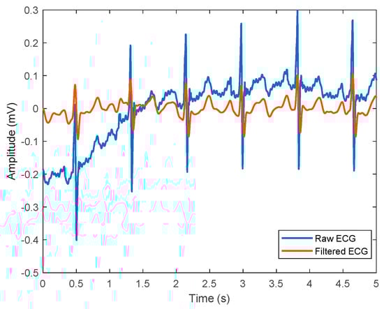 A representation of ECG signals, where the blue line represents raw ECG signal before denoising, and the red line shows filtered ECG signals that are ready for further analyses.