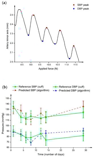 In a different approach, Zakrzewski et al. [69] measured arterial tissue displacements using US strain elastography and converted these to estimate pulse pressure using algorithms. Slow compression sweeps were applied to the carotid artery and the results demonstrated the pressure waveforms, as shown in Figure 6a. It was found that the artery was greatly compressed as an effect of increasing the applied force, suggesting the resistance of the artery wall against deformation [70]. In addition, the peaks and throughs of the pressure waveform are labelled as SBP (red) and DBP (blue), respectively. This work is an extension of previous study [71] that included real subjects with no history of CVD and hypertension over the course of one month. Figure 6b displays BP sweeps of a hypertensive subject. It was observed that since the first sweep, the BP level kept decreasing until it reached to a point slightly before the tenth day, where it started to show a noticeable increase. The reported results could be due to the history of hypertension, which confirmed the prevention of any BP spike during the earlier sweeps through medication intake. Additionally, the predicted SBP and DBP were comparable with the cuff-based BP values. Although the utilized approach of continuous BP estimation varies from one group to another, the proposed works achieved satisfactory results, and this could be a groundwork for bridging the gap in continuous NIBP monitoring enabled by US.