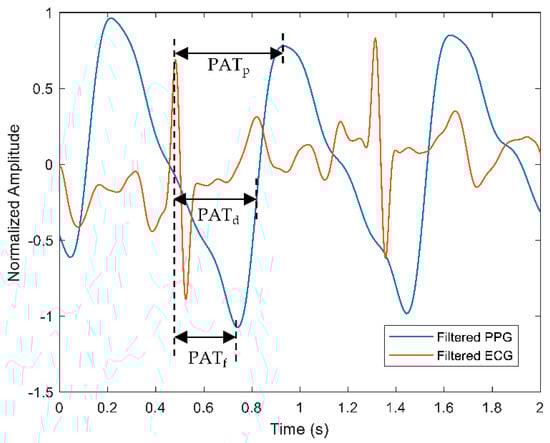 One way of predicting BP values continuously is by performing the PAT calculation on acquired pulse signals from PPG and ECG type of sensors. PAT can be expressed as the time taken for the pulse wave to travel from the heart to the peripheral location. In general, the PAT at the specified points of the PPG signals was derived from the beginning of the heartbeat at the R-peak of the ECG, as displayed in Figure 7.