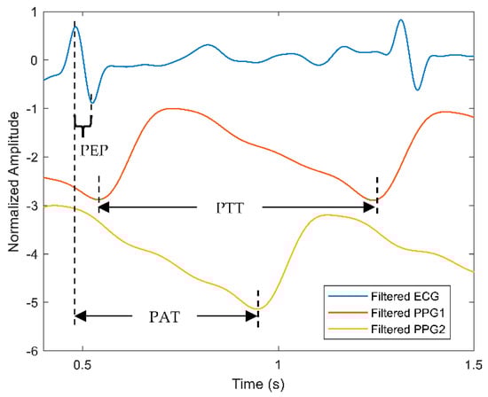 The points could be from the R-peak of the ECG signal to the foot of PPG (), the mid-point of the PPG () or the peak of the PPG () waveform. The measurement of PAT usually includes the pre-ejection period (PEP) that incorporates the heart’s electromechanical delay, which explains the relationship of the PEP and PTT, as shown in Equation (1).