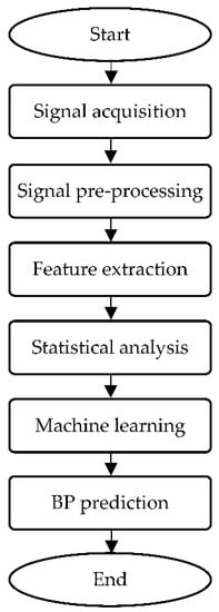 ML is the ability of self-learning from past experiences to generate desired results, such as prediction, classification, or feedback [86]. This technique has shown tremendous potentials in disease prediction [87,88,89,90]. BP estimation obtained from NIBP sensors, such as PPG and ECG, requires signal analysis, including pre-processing, feature extraction, statistical analysis, and regression or classification. Figure 9 displays the flowchart of signal analysis performance to estimate BP for continuous NIBP monitoring.