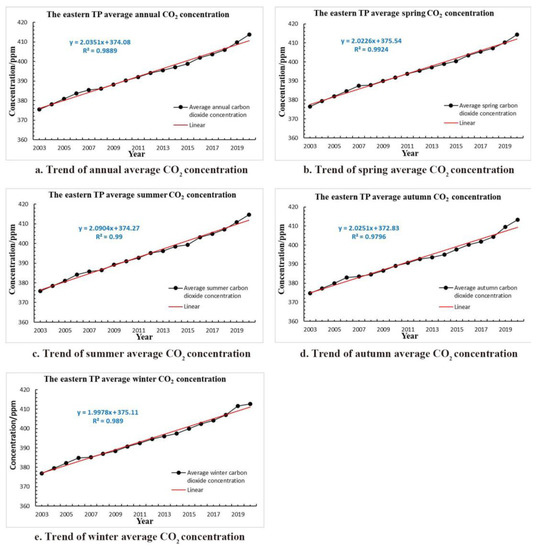 Trend of average CO2 concentration over the eastern TP during 2003–2020 in (a) annum; (b) spring; (c) summer; (d) autumn, and (e) winter.