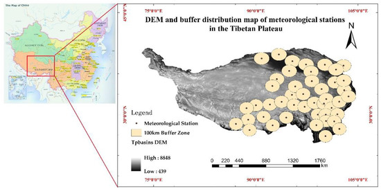 Due to the sensitivity of the Tibetan Plateau (TP) to global climate change, many scholars have conducted research on climate elements of TP and its surrounding areas in recent decades. Global glaciers have been projected to lose 18–36% of their 2015 ice volume by the end of the 21st century due to many primary drivers, such as air temperature, snowfall, rainfall [1]. Especially, some scholars have analyzed the spatiotemporal patterns of China’s glaciers in the past half-century, and pointed out that, due to climate changes and local scale factors, glaciers on the TP retreated from the northwest to southeast, with a high mass loss of glaciers in the southeastern TP [2,3,4,5]. The extreme precipitation and temperature caused by climate change leads to frequent disasters. The evaporation of soil moisture in southwestern China has increased due to temperature increase, which leads to the decrease of slope stability. Combined with the increase of precipitation, the probability of geological disasters, such as glacier debris flow and mountain landslides, has also increased [6,7]. Furthermore, the spatiotemporal changes of climate change factors such as temperature and precipitation directly affect the habitat conditions of plants growth and ecosystem productivity. Many dynamic vegetation models and methods have been used to evaluate the influence of climate change on the ecosystem of the TP [8,9]. For example, Shen et al. used the Maximum Enhanced Vegetation Index (MEVI) to analyze the vegetation cover changes in the growing period of the TP from 2000 to 2012 [10]. Some researchers analyzed the spatiotemporal variation trends of the NDVI and its relationship with precipitation and temperature over the TP in the past 40 years [11,12].