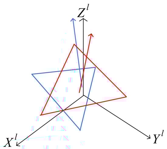 In the lidar coordinate system, two plane equations are obtained. Due to measurement error, the coefficients of the two plane equations are different; hence, it is necessary to define an error equation to measure the degree of inconsistency. In Figure 3, there are two fitted planes in the lidar coordinate system. The blue plane represents the plane of global uniform ground conversion to the radar coordinate system, and the red plane represents the plane of RANSAC fitting. Their normal vectors correspond to vectors of the same color [21].