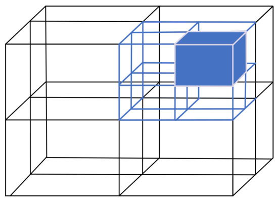 In this experiment, an octree was used to construct a map model, which can not only compress the size of the point cloud data but also quickly search the state of the grid. The octree divides the whole point cloud map into eight equal parts. The schematic diagram of the octree is shown in Figure 4.