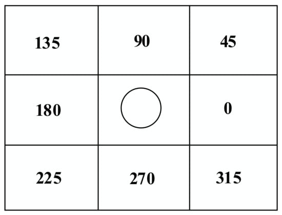 When the mobile robot is in actual operation, the turning time of the inflection point cannot be ignored. By adding the steering cost model into the total cost function, the planned path is in line with the operability of the actual mobile robot. The mobile robot is set to turn toward the center point of the grid each time, and the steering cost angle model is as shown in Figure 6 and Figure 7.