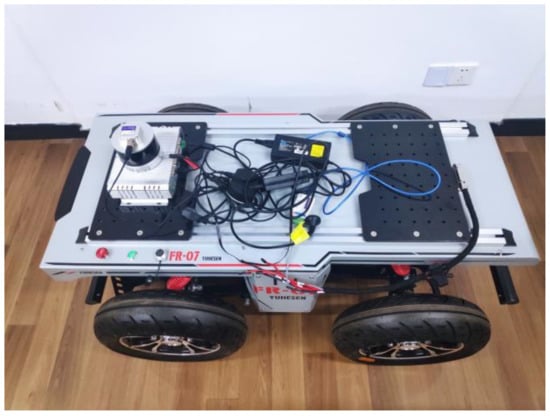 The emulation configuration used in this work was as follows: Ubuntu18.04; Ros-melodic; Quadruped driven mobile robot; Hesai PandarXT-16; Lpms-IG1-4 85 IMU. The horizontal angular resolution of the lidar sensor was 0.09°, approximately 60,000 point cloud data were collected per frame, and the angular resolution of the IMU was 0.01°. The experimental device of this experiment is shown in Figure 8. Through data collection in the indoor environment, the total data size was 2.8 GB, the total duration was 93.19 s, and the total distance was 20.36 m.