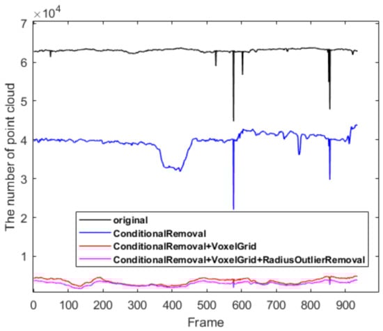 The sensor information collected in the indoor environment was successively filtered using ConditionalRemoval, VoxelGrid, and RadiusOutlierRemoval, and the changes in the number of point clouds are shown in Figure 9. From the original, more than 60,000 point clouds were filtered to yield more than 2000 point clouds, thereby improving the speed of system mapping.