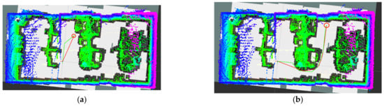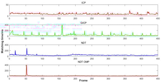 The comparison results of the running time of the four inter-frame matching algorithms in the indoor environment are shown in Figure 10. The ICP algorithm and NDT_OMP algorithm performed better according to the evaluation criterion of time consumption.