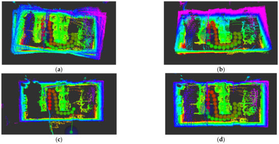 Drawing effect of four matching algorithms. (a) ICP-mapping, (b) GICP-mapping, (c) NDT-mapping, (d) NDT_OMP-mapping.