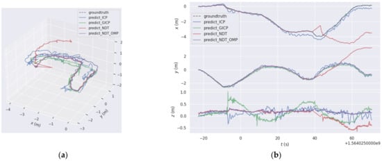 In the indoor environment, the 3D space track effect and the XYZ direction track coordinate values are shown in Figure 12. The figure shows the trajectories of the four matching algorithms in 3D space and the views in the XYZ direction. It can be seen from the figure that the ICP algorithm had a serious drift phenomenon. The predicted trajectories of the NDT_OMP algorithm were closer to the reference trajectories, and the mapping effect of the NDT_OMP algorithm was the best. Figure 13 shows the relative error of the predicted trajectory and the reference trajectory using the NDT_OMP algorithm in an indoor environment. It can be observed that the ICP algorithm had a huge elevation error. The relative error of the NDT_OMP algorithm with respect to the reference trajectory was within the acceptable range, and there were no sections with a large error. The results show that the NDT_OMP algorithm could meet the real-time accuracy of map construction in an indoor environment.