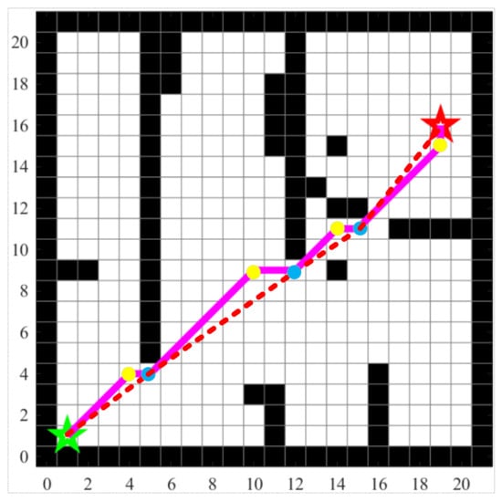 Many scholars have improved the A* algorithm, e.g., the JPS (jump point search) algorithm, which improves the search speed of path planning by reducing the operation of OpenList tables. However, through experiments, we found that there were redundant points in the final path planned by the JPS algorithm. In a large map, the path planned by the JPS algorithm would increase the work of the mobile robot. Figure 14 shows a result of the JPS algorithm. Looking at Figure 14, it can be seen that the red dashed line had a shorter path length than the pink solid line; therefore, the yellow points were redundant nodes, which could be removed in the path set, thereby reducing the path length and the power consumption of the mobile robot in the process of moving. The improved algorithm proposed in this paper can remove such redundant points and simplify the nodes of the path set. In addition, the A* algorithm is extensible and can be applied to grid map, Navmesh, and Waypoint nodes, while the JPS algorithm is only applicable to grid map nodes.