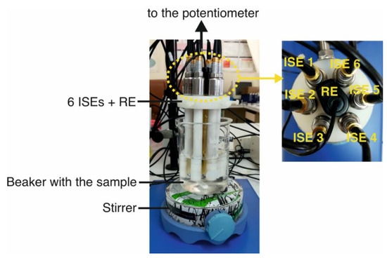 The six-electrode array was immersed in 50.0 mL of 1.0 × 10−6 M KCl solution with constant stirring (300 rpm) for 50 s (see Figure 1). The potential recorded by each electrode is visualized in the software. Then, a 10.0 mL aliquot of the water sample to be analyzed was added. The potential of each of the six electrodes was registered during the entire process, and the potential values finally reached after 100 s of the beginning of the experiment were considered for following data processing. Before measuring the next sample, the electrodes were gently washed with water and dried. Each natural water sample was analyzed in triplicate, while a total number of nine measurements were collected for the tap water sample (triplicate signals at the beginning, within and at the end of the entire analysis). The generated pool of signals allowed for reproducibility/repeatability and hysteresis evaluation, while providing a reasonable analysis time for all the samples’ measurements and thus, the generation of the data needed for the ET. Then, the potential signals were processed using the standard data analysis tools (numpy, scikit-learn, pandas, matplotlib) of the Python language, for principal component analysis and linear regression.