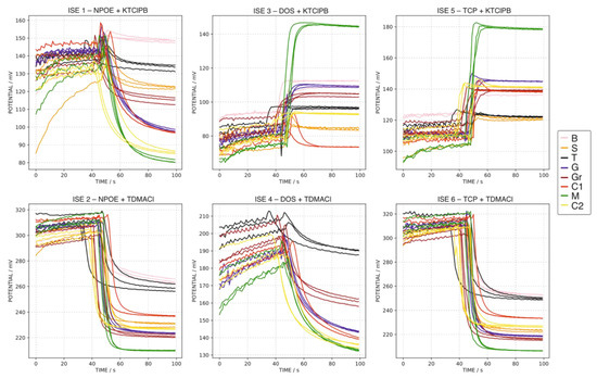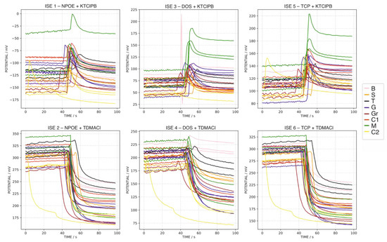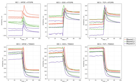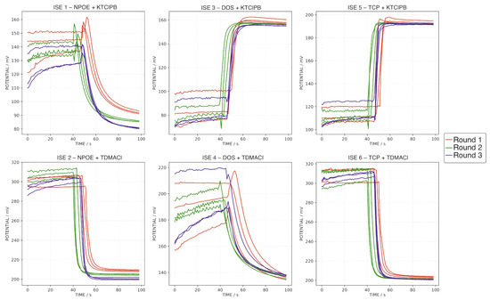 Regarding the ISEs displaying a cationic response (1, 3 and 5), most of the signals presented a remarkable non-monotonic behavior characterized by an initial period in which the signal increased followed by a decreasing trend until a (close to) steady-state value. This kind of non-monotonic signal has been previously reported for ISEs prepared without any ionophore, being analogous to those used in the present work [19,20]. The response of the ISE 1 based on NPOE as the membrane plasticized is of particular interest because the final potential for most of the samples is remarkably lower than that observed for the baseline in the 1.0 × 10−6 M KCl background solution. A similar behavior was observed for the responses collected by the first measurement protocol (Figure 2) but obtaining a final potential rather similar to or a slightly lower than that recorded in MilliQ water background.