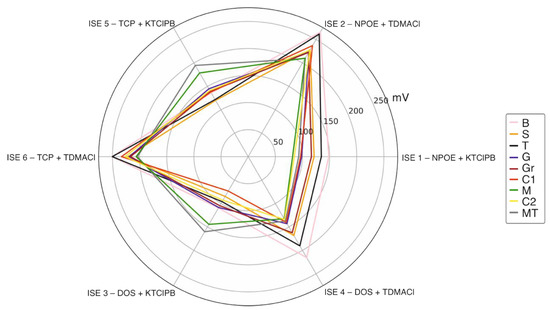 More in detail, those samples with the lower conductivity values (<200 µS cm−1: B, S and T) presented a PC1 ranging from 0.04 to 0.09, whereas the samples with higher conductivity (from 1000 to 2000 µS cm−1: MT and M) displayed PC1 values ranging from −0.07 to −0.04. Samples with intermediate conductivity appear in the middle part of Figure 8, with PC1 values ranging from 0 to 0.03. Of note is that the S sample is separated from B and T, which can be due to its higher content in nitrate (Table 3). It is remarkable how the ET can differentiate between the three samples with the lower conductivity and labelled by the corresponding manufacturer as “low mineralization water”. It would be interesting to further utilize the ISE system here developed to analyze more water samples with low conductivity (and thus mineralization) to understand whether the ET can be particularly used to classify these samples according to their origins (e.g., geography, type of stone in the aquatic resource, etc.).