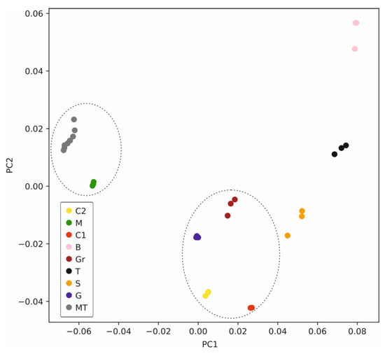 Principal component analysis. Plot of PC1 versus PC2 calculated for the pool of samples and including the three MT repetitions along the analysis.