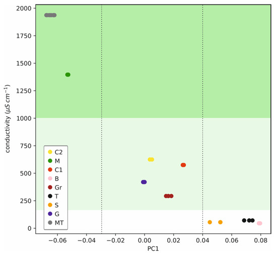 We hypothesized that the samples were grouped into three categories in Figure 7 (group 1: MT and M; group 2: C2, C1, Gr, and G; group 3: B, S and T, according to the drawn ellipses). Then, we deeply explored possible relationships of either PC1 or PC2 with the sample conductivity, attempting to understand the potential of the PCA for the further quantification of ion content in the sample and hence to verify our classification hypothesis. Effectively, the value for PC1 was found to be related to the conductivity of the water sample, and hence, three different regions (for high, medium and low conductivity) were distinguished in the plot of conductivity versus PC1 (Figure 8).