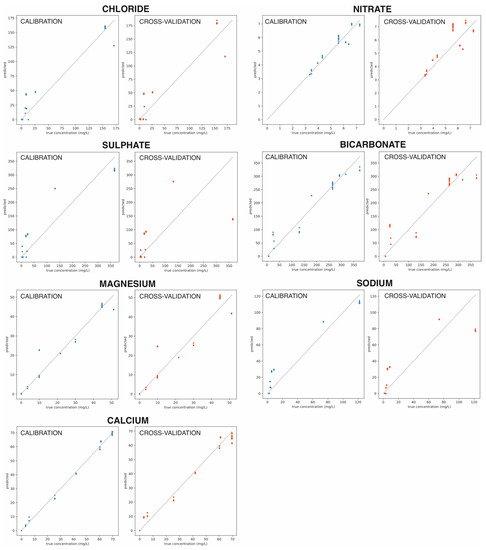 Calibration and cross-validation models (predicted versus true concentration values) obtained for all the ions tested in the mineral water samples.