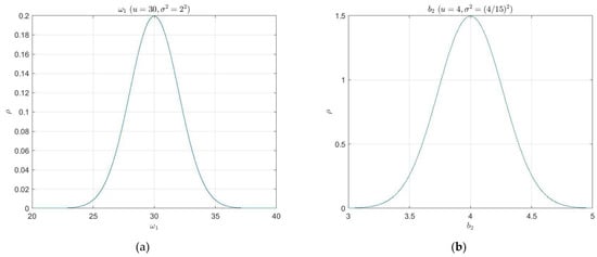 The Gaussian probability density function curves for the six variable parameters: (a) The natural frequency of elastic mode ; (b) The kinetic coefficient ; (c) The kinetic coefficient ; (d) The kinetic coefficient ; (e) The external disturbance of pitch angle ; (f) The external disturbance of elastic modes.