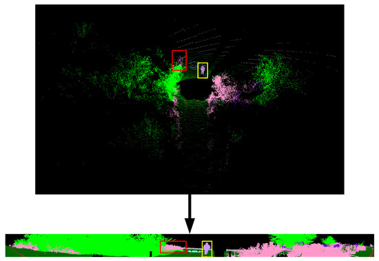 The evaluation results of the SemanticPOSS dataset are shown in Table 7. For SemanticPOSS, the SegUNet3D method is significantly superior to image-based and range image-based methods. In particular, 9.2% higher mIoU value was obtained from SqueezeSegV2, and was 15.9% higher than PointSeg and 0.9% higher than SalsaNext. Especially in the building, road, and plant classes in the urban area, higher IoU value is obtained. However, lower IoU values were obtained in classes such as the rider, pole, and traffic sign. The main reason is the amount of training data. Building, road, and plant classes have higher evaluation metrics in semantic segmentation because the urban area has many buildings, roads, and plants. The semantic segmentation results of SemanticPOSS dataset are shown in Figure 6 and Figure 7.