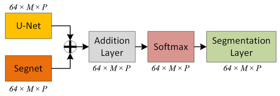 Each of the U-Net and SegNet architectures has been successful in inferring different classes in classification. Based on this finding, it was hypothesized that averaging the output weights of the algorithms would yield better results than the individual methods themselves. The created range images are processed in U-Net and SegNet architectures in two streams and weights are obtained in the designed architecture. The latest model weights are calculated by averaging the weights from the two channels. Two vectors of 64 × M × P, M width size, and P weights from the last convolutions in decoder of U-Net and SegNet are summed. Then, the weights are normalized in the softmax layer and transferred to the segmentation layer (Figure 4).