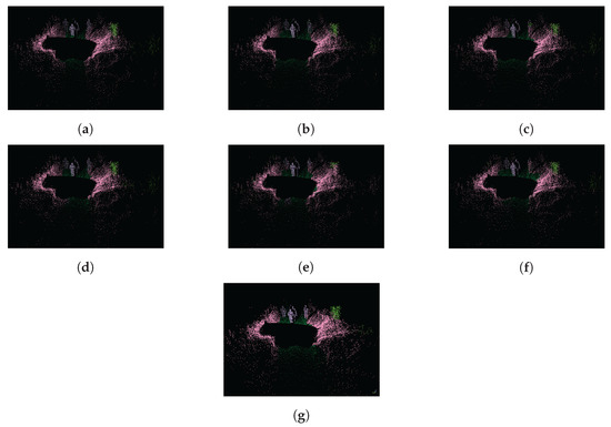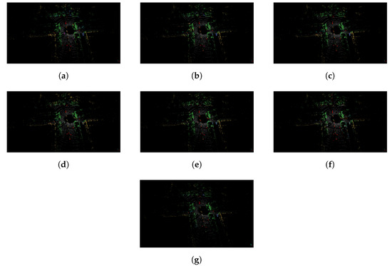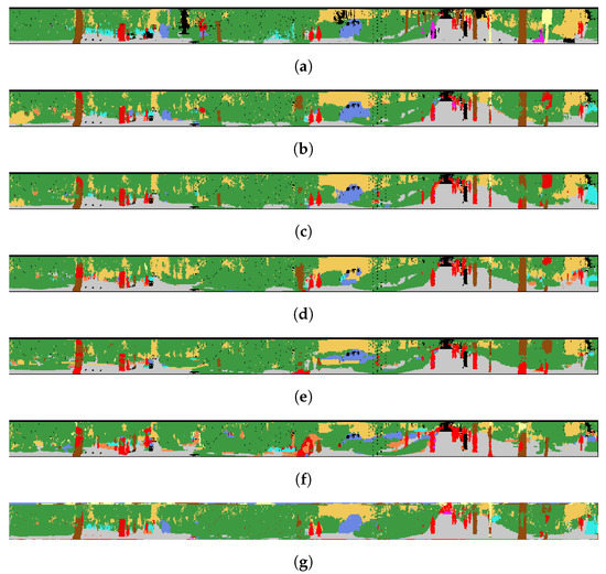 Semantic segmentation results of the SemanticPOSS dataset are presented as point clouds. (a) Ground Truth; (b) SegUNet3D; (c) SegNet; (d) U-Net; (e) SqueezeSegV2; (f) PointSeg; (g) SalsaNext.