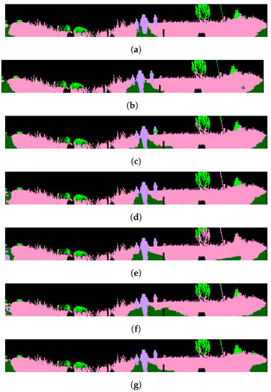 Semantic segmentation results of the RELLIS-3D dataset are presented as point clouds. (a) Ground Truth; (b) SegUNet3D; (c) SegNet; (d) U-Net; (e) SqueezeSegV2; (f) PointSeg; (g) SalsaNext.