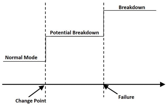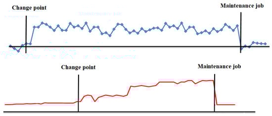 The change point is always related with some physical change of the component. In the case of oil or lubricant, we know there is a sudden change in performance, mainly because, when the oil is approaching the end of its useful life, its viscosity changes abruptly. When a component or part is subjected to a constant load, the elongation that suffers over time is known as “the creep curve” where, at the end of its life there is an accelerated elongation, see [13]. Something similar happens with the elasticity coefficient. When a part is subjected to continuous bending, such as a train track, see [14,15], and the end of its useful life is approaching, there comes a point where it will not recover its starting position. There are different techniques to detect change points, such as EWMA, CUMSUM, MSE, etc., see [15]. Given their relevance to CBM, new techniques are being researched for more complex cases, see [16], and a special package has even been developed for R, see [17].