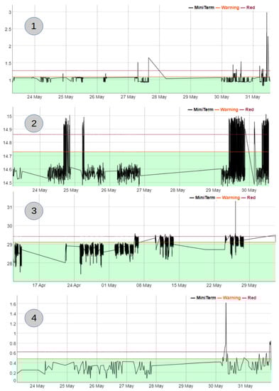 In the literature, an initial calibration is usually carried out to adjust the algorithms to the initial state of the machines or components, see [25]. On the other hand, there is a widespread use of numerical indicators in the detection of change points in the industry, see [26,27,28]. The great advantage of using numerical indicators is the possibility of adapting and developing new indicators in order to adapt them to different types of characteristics. However, this advantage could be a problem if you want to generalize the indicators for whatever component, that is the case of mini-terms. Therefore, a robust and general algorithm is welcome for those cases.