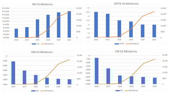 Figure 10 shows the evolution of these indicators between the years 2016–2021 and compares it with the number of mini-terms installed. Due to industrial data protection issues, these graphs do not show the actual values of each indicator but instead they show the incremental improvement of each indicator since the initial year, 2016. In this comparison, and the effects that mini-terms cause, we need to take into account the improvement of the algorithm for detecting the change points and its increased reliability over the years. With respect to TAV, it has undergone an improvement of 18% from 2016 to 2021. In the case of the MTTR, it has been reduced by 2 h. Regarding the number of work orders, these have been significantly reduced thanks to the prediction of failures, eliminating about 3000 orders/year, while working hours have also been drastically reduced by almost 4000 h/year.