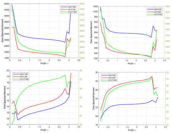 The first spectral moment for F160, at a value of approximately α = 2.765, changes its waveform character; in the undamaged case, the curve of the spectral moment rises; when the damage emerges, the values begin to decrease to approximately α = 2.985, and then they start increasing again.