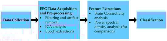 The structure of the paper is as follows: Section 2, materials and the methods, covers the general structure of the experiment, data collection, experiment conditions, EEG data processing, connectivity analysis, and classification. In Section 3 are the results of the independent component analysis, connectivity analysis results, and classification accuracy results. Section 4 discusses the results, and Section 5 follows up with the study’s conclusion.
