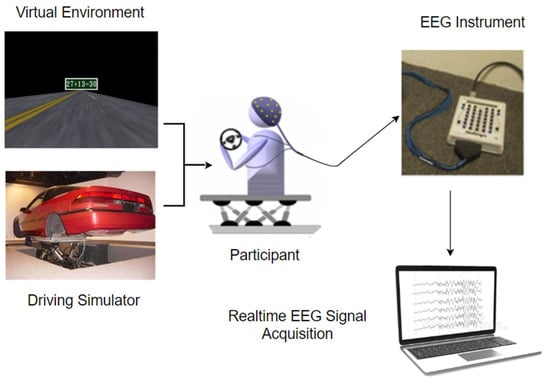 Prominent techniques to detect driver distractions are monitoring the driver’s behavior using a camera and image processing technique or monitoring the brain’s activity using an electroencephalogram (EEG) [10,11,12,13,14,15]. When monitoring the driver’s behavior, image processing techniques are used to detect either the eye movement or the driver’s activities using a camera. Physiological assessment of facial or eye movements using captured images or video recordings of the driver’s face may lead to privacy issues compared to the physiological measurement methods [16]. Furthermore, an EEG [17,18] directly measures the neurophysiological signals from the source, and it can easily be correlated with distractions [19,20,21,22], driver fatigue [13,23], and drowsiness [24].