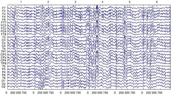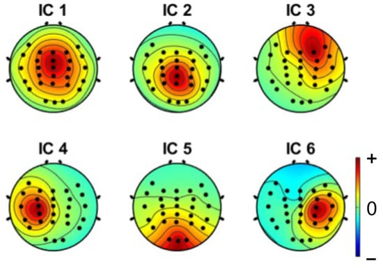 Brain components were selected from the ICA analysis, and the noise components were removed. A previous study [47] showed that the frontal, central, parietal, left motor and right motor areas are more useful in driver distraction detection. Hence, with the expert’s help, relevant components for the frontal, central, parietal, left motor, and right motor were selected. Selected independent components of non-distracted and distracted tasks for a participant are shown in Figure 9 and Figure 10. ICs 2, 3, 4, 8, 12, and 17 in Figure 6 and Figure 8 are equivalent to ICs 1, 2, 3, 4, 5, and 6 in Figure 10, respectively. ICs 2, 3, 6, 7, 10, and 18 in Figure 5 and Figure 7 are equivalent to ICs 1, 2, 3, 4, 5, and 6 in Figure 9, respectively.