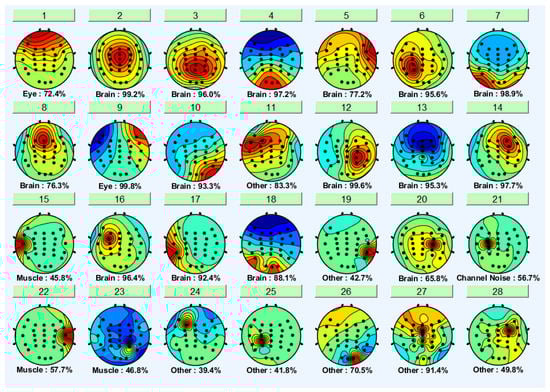 The output of EEGLAB-ICA label function (brain signal vs. noises) from the distracted driving task.