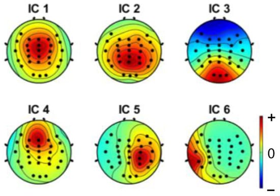 Selected independent components of a participant, where IC1-central, IC2-parietal, IC3-frontal, IC4-left motor, IC5-occipital, and IC6-right motor components are shown.