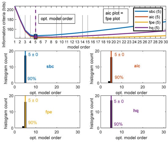 To calculate the MVAR model, model order should be calculated. To estimate the optimal model order EEGLAB’s Source Information Toolbox (SIFT) was used [53]. Bayesian information criterion (BIC) (Schwarz–Bayes criterion (SBC)), Akaike’s information criterion (AIC), Hannan–Quinn criterion (HQ), and the Akaike’s final prediction error criterion (FPE) with the elbow of the mean curve and the min of mean curve methods were used. Model order range from 1 to 30 was selected to estimate the optimal model order for the given epoch.