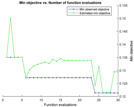 where denotes the data points, and indicates the width of the kernel. Bayesian optimization was used with the expected improvement plus acquisition function to optimize the training model. Furthermore, 30 object evaluations were considered in the optimization process [55]. Hyperparameters were tuned by minimizing the five-fold cross-validation loss using the Bayesian optimizer and expected improvement plus acquisition function.