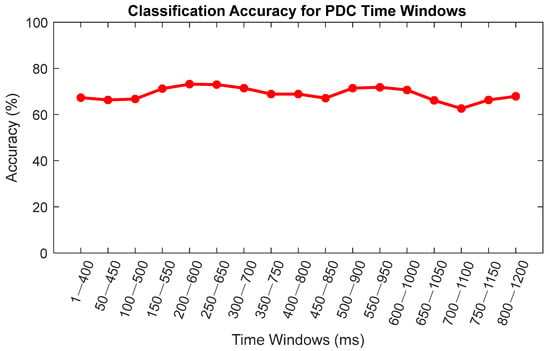 The highest classification accuracy was obtained using the PDC connectivity estimator. Hence, the PDC connectivity estimator was selected for further analysis. To determine the best time window to separate the distracted and non-distracted driving tasks, features containing connectivity matrixes for each time window were used to train and optimize an SVM model with an RBF kernel. Figure 14 shows the classification accuracies for the 17 time windows.