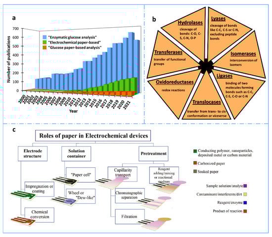 Figure 1. (a) Number of results obtained per year when searching “enzymatic glucose analysis”, “electrochemical paper-based” and “glucose paper-based analysis” in the Scopus database for the last 22 years (2000–2021). (b) Classification of the enzymes according to the International Union of Biochemistry and Molecular Biology [11]. (c) Schematic representation of the main roles of paper in electroanalytical devices. Reprinted from [12], Copyright (2020), with permission from Elsevier.