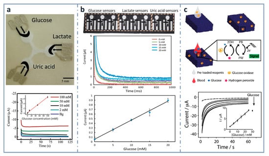 Figure 3. Screen-printed, paper-based biosensors. (a) Picture of the first three-electrode paper-based device for the determination of glucose, lactate and uric acid (top) and chronoamperograms for glucose with the calibration plot in the inset (bottom). Reprinted from [90], Copyright (2009), American Chemical Society. (b) Paper-based electrochemical biosensor array (top), chronoamperometric curves (center) and calibration plot for glucose in artificial urine (bottom). Reprinted from [134] (open access). (c) Measurement scheme of the glucose biosensor on Paper Blue (top), chronoamperometric detection of increasing concentrations of glucose with calibration curve of glucose up to 30 mM in the inset (bottom). Reprinted from [135], Copyright (2018), with permission from Elsevier.
