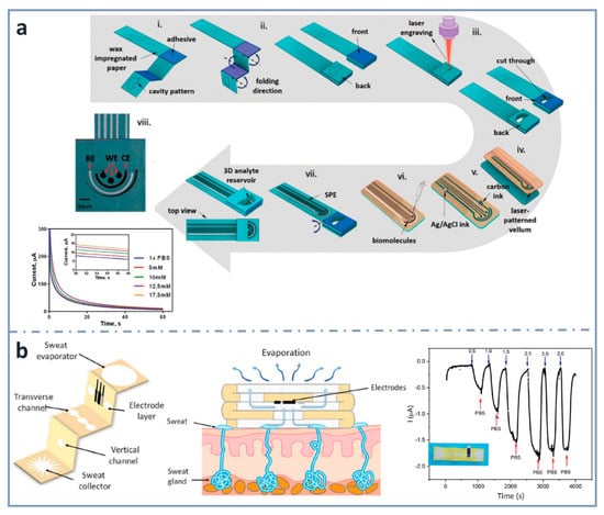 • Layer stacking or multilayer: It consists of piling up different layers of patterned paper, following some of the strategies described before. The flow direction can be both horizontal, as in lateral flow assays, or vertical, as in the paper-based optical glucose biosensor developed by Chun et al. [123]. They formed hydrophobic barriers by wax printing and then made a multilayer platform with different loading and detection zones. Another example is the paper-based microfluidic device for glucose monitoring that uses MOFs to immobilize the enzymes and a 3D µPAD placing paper-based wax-printed chips for detection between polyvinylchloride layers [124]. Layers of materials different from paper could be included; for example, adhesive tape and hollow channels [125] could be added to improve fluidics.