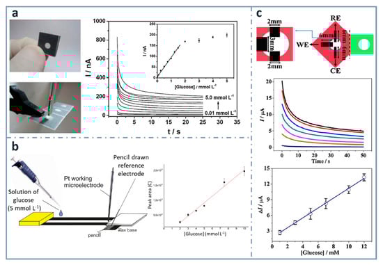 Screen printing was the technique used for the first ePAD developed in 2009 [90] (Figure 3a), and it is the most common strategy employed for incorporating electrodes on paper. A screen or stencil, which is usually made of polymers, such as Nylon®, with the desired electrode pattern is required. The conductive ink is forced to pass through this stencil, by pressing with a squeegee or using specific machines, transferring the pattern to the substrate. In the first reported ePAD that has already been commented on, a first layer with silver/silver chloride ink (for connections and reference electrode) was deposited and then, carbon ink containing the mediator Prussian Blue was applied on working and auxiliary electrodes. As a proof of concept, this design was used for the simultaneous determination of glucose, lactate and uric acid using oxidase enzymes (glucose oxidase, lactate oxidase and uricase, respectively). In the case of glucose, the analyte of interest in this review, the linear dynamic range was up to 100 mM and the limit of detection (LOD), 0.21 mM. Since then, screen-printing technology has been used for developing ePADs for years. In 2013, the same analytes (glucose, lactate and uric acid) were determined by Zhao et al. [134] (Figure 3b) using a microfluidic paper-based electrochemical array, patterned by wax printing and using a handheld custom-made potentiostat for signal readout. This device provided a dynamic linear range for glucose comprised between 5 and 20 mM, with an LOD of 0.35 mM.