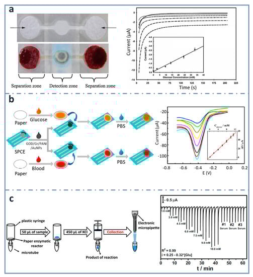 Within the aim of developing micro-total analysis systems (µTAS), integrating different operations in the paper-based device, Cinti et al. developed, in 2018, a glucose electrochemical biosensor for whole blood analysis [135] (Figure 3c), which used filter paper in which Prussian Blue nanoparticles were synthesized using very low volumes of precursors and with no need of external inputs. In this modified paper, whose authors called “Paper Blue”, wax and screen-printing technologies were combined for manufacturing the glucose biosensor using glucose oxidase as the recognition element. Glucose was detected amperometrically at concentrations up to 25 mM, with an LOD of 0.17 mM and a sensitivity of 1.70 µA·mM−1. This biosensor was applied to the determination of glucose in real blood samples, monitoring normal or pathological conditions related to glucose levels in whole blood. The µTAS approach was also exploited [136] for the development of an ePAD for the detection of glucose that contained different reservoirs for the buffer, electrochemical mediator (ferricyanide) and enzyme (FAD-dependent glucose dehydrogenase, in this case), which were successively mixed after inserting the sample by dropping. They obtained a wide linear range, between 0.5 and 50 mM, with an LOD of 0.33 mM.